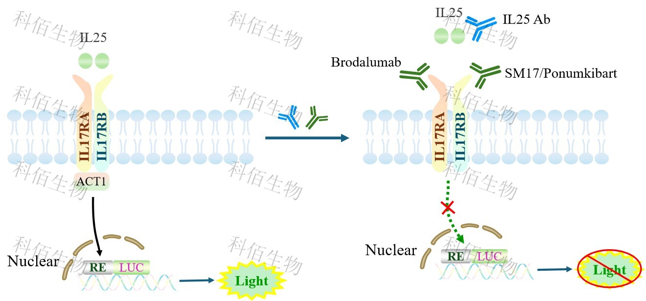 IL25 Effector Reporter Cell(Adherent)報(bào)告基因藥靶模型很好的模擬了體內(nèi) IL25 的信號(hào)轉(zhuǎn)導(dǎo)過(guò)程,原理見(jiàn)下圖所示。![]() Figure 1. IL25 Effector Reporter Cell(Adherent)細(xì)胞模型原理圖 |