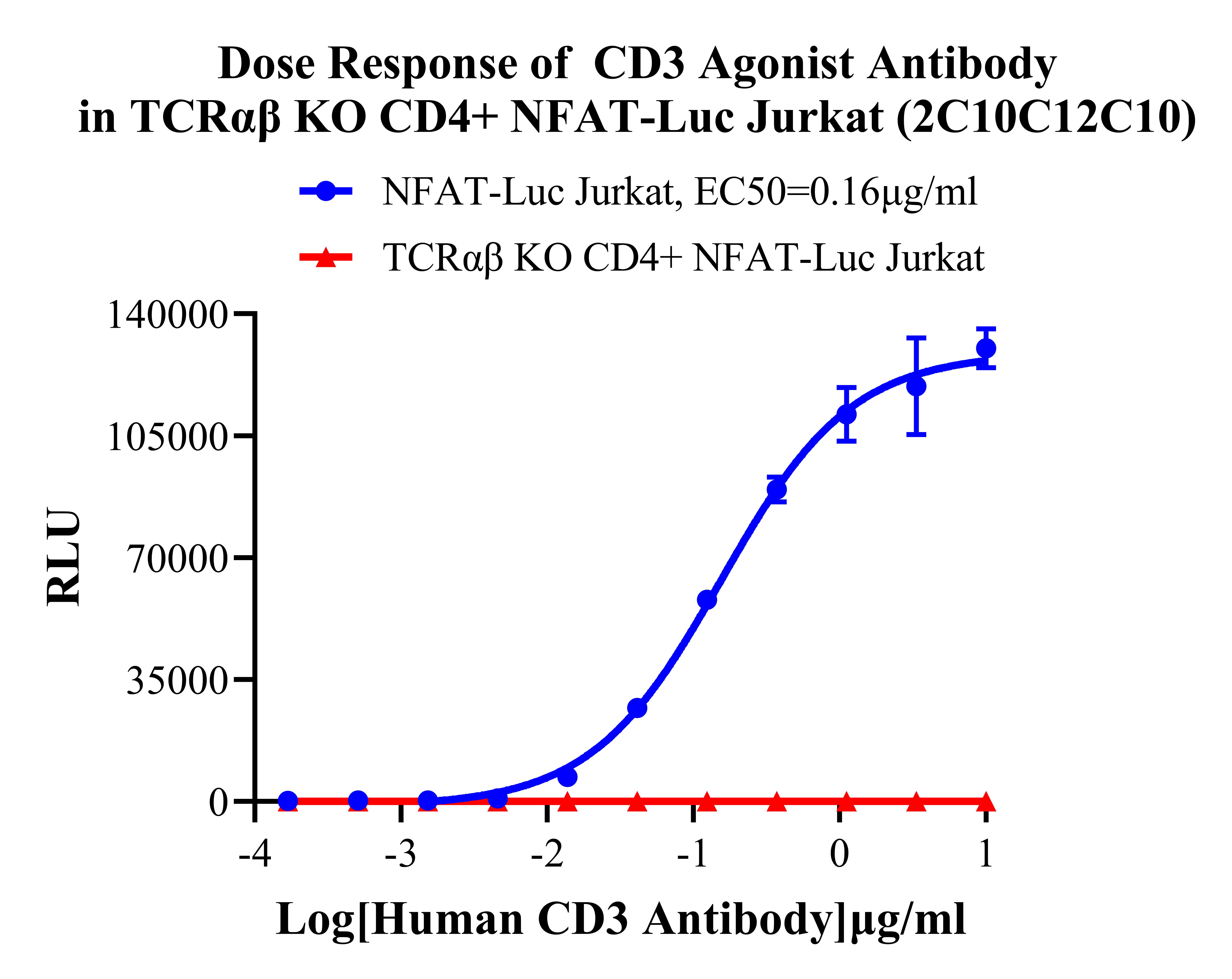 ![]() Figure 1. TCRαβ KO CD4+ NFAT-Luc Jurkat 細(xì)胞,在 NFAT-Luc Jurkat 細(xì)胞上敲除 TCRαβ,表達(dá)CD4。 ![]() Figure 2. Dose Response of CD3 Agonist Antibody in TCRαβ KO CD4+ NFAT-Luc Jurkat (2C10C12C10).