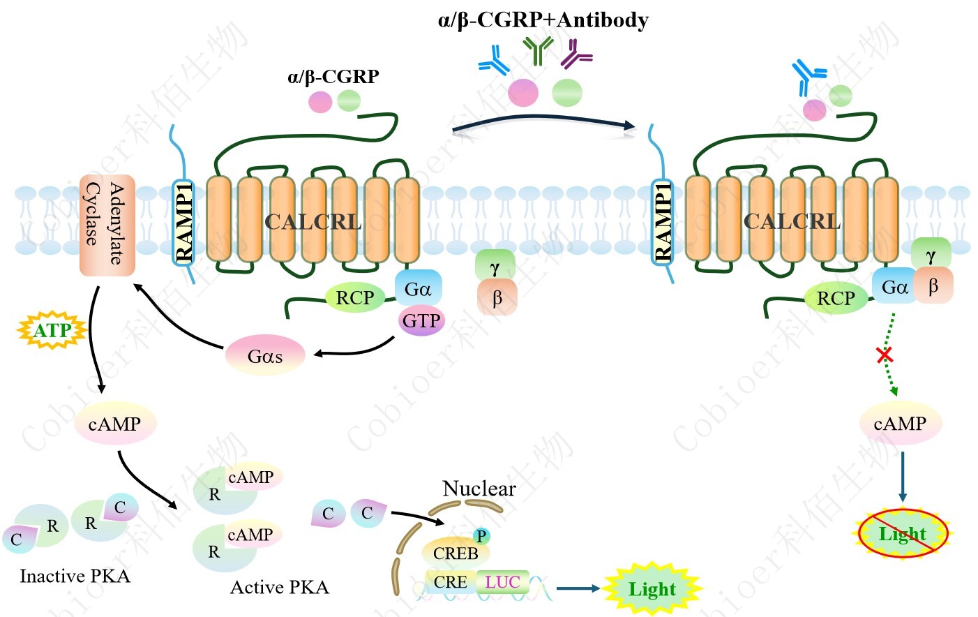 | 降鈣素基因相關(guān)肽(CGRP)家族包括 CGRP 本身、降鈣素(CT)、腎上腺髓質(zhì)素(AM)和 胰島淀粉樣肽(AMY)。 神經(jīng)肽降鈣素基因相關(guān)肽(CGRP)是中樞和外周神經(jīng)元產(chǎn)生的一種有效的血管擴(kuò)張劑。 CGRP 在人體內(nèi)以α - CGRP 和β - CGRP 兩種形式存在。α - CGRP 和β - CGRP 都是受體的完 全激動(dòng)劑。CGRP 通過(guò) CGRP 受體介導(dǎo)其作用,CGRP 受體是一種異二聚體復(fù)合物:G 蛋 白偶聯(lián)受體 CALCRL 和單跨膜結(jié)構(gòu)域蛋白受體 RAMP1。功能 CGRP 受體所需的最后一個(gè) 成分是受體成分蛋白(RCP)。缺乏 RCP 已被證明會(huì)影響 CGRP 受體的激活,以環(huán)磷酸腺苷 (cAMP)的增加來(lái)衡量,而不影響配體的結(jié)合。受體的主要功能單元 CALCRL(也稱為 CLR 或 CRLR)可以連接到三種 RAMPs 中的一種,這三種 RAMPs 分別產(chǎn)生不同的受體。 RAMPs 是單跨膜蛋白,對(duì)受體功能至關(guān)重要,因?yàn)樗鼈儏⑴c受體復(fù)合物向質(zhì)膜的易位,并 進(jìn)一步提供配體結(jié)合的特異性。CALCRL 與 RAMP1 組成 CGRP 受體;RAMP2 是 AM 受 體,命名為 AM1;RAMP3 是 CGRP/AM 雙受體,命名為 AM2。RAMP1 亞基負(fù)責(zé) CGRP 與 CGRP 受體的特異性結(jié)合。 配體結(jié)合后,復(fù)合物與 G 蛋白相互作用,Gαs 亞基從復(fù)合物中分離并激活腺苷酸環(huán)化 酶,產(chǎn)生 cAMP。細(xì)胞內(nèi) cAMP 濃度升高刺激 cAMP 依賴的信號(hào)通路,最終導(dǎo)致轉(zhuǎn)錄因子 cAMP 應(yīng)答元件結(jié)合蛋白(CREB)與 CRE 啟動(dòng)子結(jié)合,誘導(dǎo)基因表達(dá)。 |