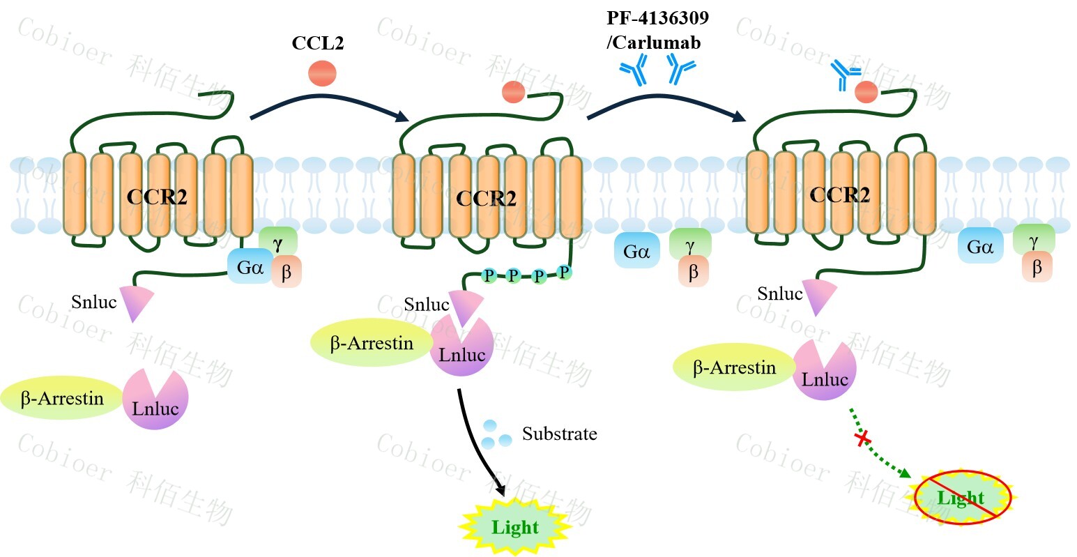 CCR2 β-Arrestin CHO 報(bào)告基因藥靶模型很好的模擬了體內(nèi) CCR2/β-Arrestin 的信號(hào)轉(zhuǎn) 導(dǎo)過(guò)程,原理見(jiàn)下圖所示。當(dāng)缺乏配體刺激時(shí),β-Arrestin 不與 CCR2 結(jié)合,融合β-Arrestin 的熒光素酶處于失活構(gòu)象,當(dāng) CCR2 遭遇配體刺激時(shí),融合熒光素酶報(bào)告基因的β-Arrestin 被招募,使熒光素酶報(bào)告基因處于激活狀態(tài),加入其底物后發(fā)光信號(hào)增強(qiáng)。![]() Figure 1. CCR2 β-Arrestin CHO 細(xì)胞模型原理圖 |