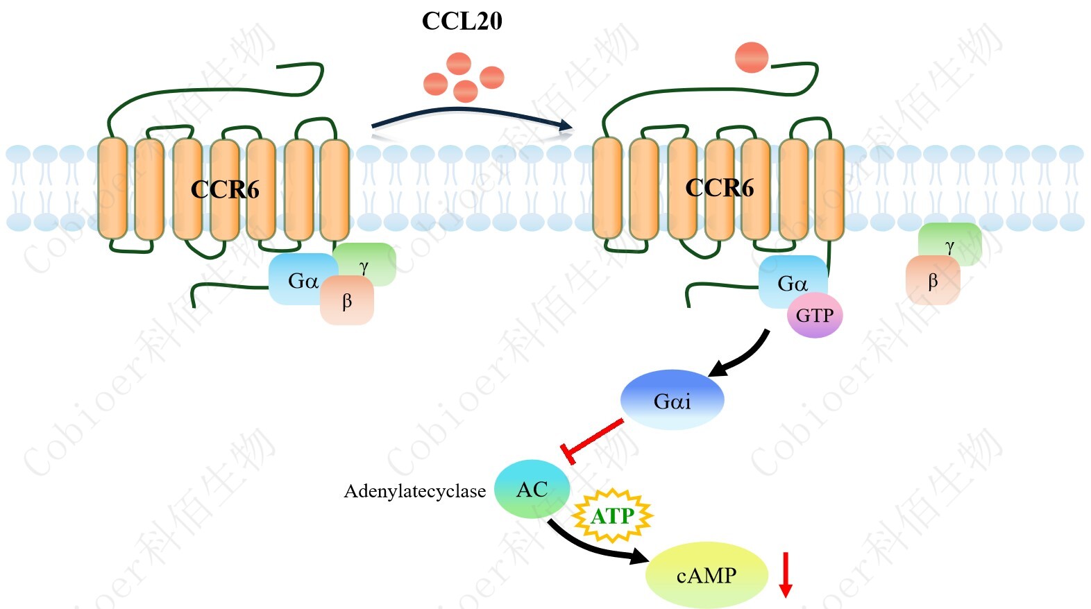 cAMP 在 G 蛋白偶聯(lián)受體(GPCR)信號轉(zhuǎn)導(dǎo)中是一種關(guān)鍵的第二信使。當(dāng)配體結(jié)合到 GPCR,構(gòu)象發(fā)生變化,激活受體接著激活 G 蛋白,Gi 的激活導(dǎo)致腺苷酸環(huán)化酶調(diào)控 cAMP 的下調(diào)。CCR6 藥靶模型很好的模擬了體內(nèi) CCR6 的信號轉(zhuǎn)導(dǎo)過程,原理見下圖所示。![]() Figure 1. CCR6 CHO 細(xì)胞模型原理圖 |