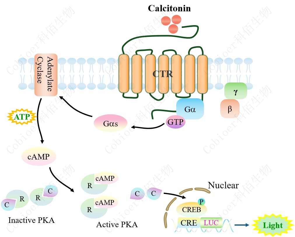 CTR(CALCR) CRE-Luc HEK293 報(bào)告基因藥靶模型很好的模擬了體內(nèi) CTR 的信號(hào)轉(zhuǎn)導(dǎo)過程,原理見下圖所示。![]() Figure 1. CTR(CALCR) CRE-Luc HEK293 細(xì)胞模型原理圖 |