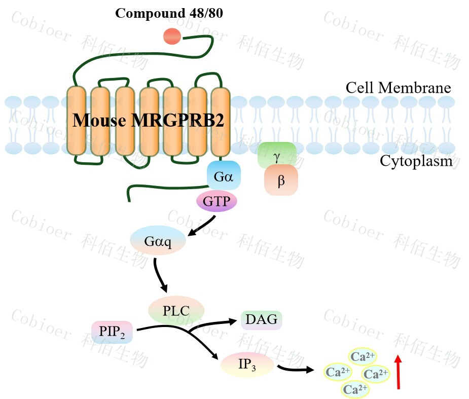 Mouse MRGPRB2 Gα15 HEK293 細(xì)胞,在 Gα15 HEK293 細(xì)胞上,穩(wěn)定表達(dá)鼠的 MRGPRB2。Mouse MRGPRB2 Gα15 HEK293 細(xì)胞藥靶模型很好的模擬了體內(nèi) MRGPRB2&Gα15 的信號(hào)轉(zhuǎn)導(dǎo)過程,原理見下圖所示。