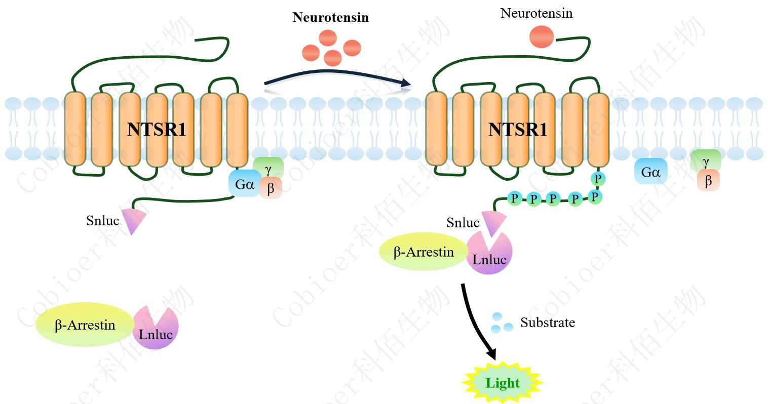 NTSR1 β-Arrestin CHO 報告基因藥靶模型很好的模擬了體內 NTSR1/β-Arrestin 的信號 轉導過程,原理見下圖所示。當缺乏配體刺激時,β-Arrestin 不與 NTSR1 結合,融合β- Arrestin 的熒光素酶處于失活構象,當 NTSR1 遭遇配體刺激時,融合熒光素酶報告基因的 β-Arrestin 被招募,使熒光素酶報告基因處于激活狀態(tài),加入其底物后發(fā)光信號增強。 ![]() Figure 1. NTSR1 β-Arrestin CHO 細胞模型原理圖 |
