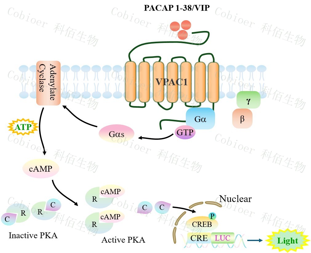VPAC1 CRE-Luc HEK293 報告基因藥靶模型很好的模擬了體內 VPAC1 的信號轉導過程,原理見下圖所示。![]() Figure 1. VPAC1 CRE-Luc HEK293 細胞模型原理圖 |