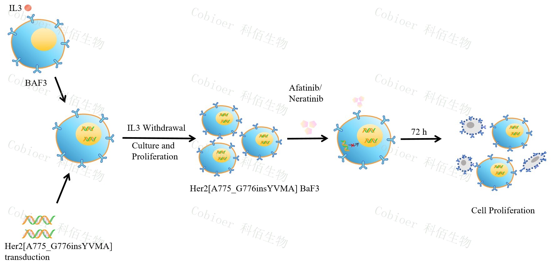 HER2[A775_G776insYVMA] BaF3 藥靶細(xì)胞,通過(guò)轉(zhuǎn)導(dǎo)突變狀態(tài)的 HER2[A775_G776insYVMA] 基 因 到 BaF3 細(xì) 胞 系 中 , 穩(wěn) 定 表 達(dá)人突變形態(tài)下的 HER2[A775_G776insYVMA] 基因。