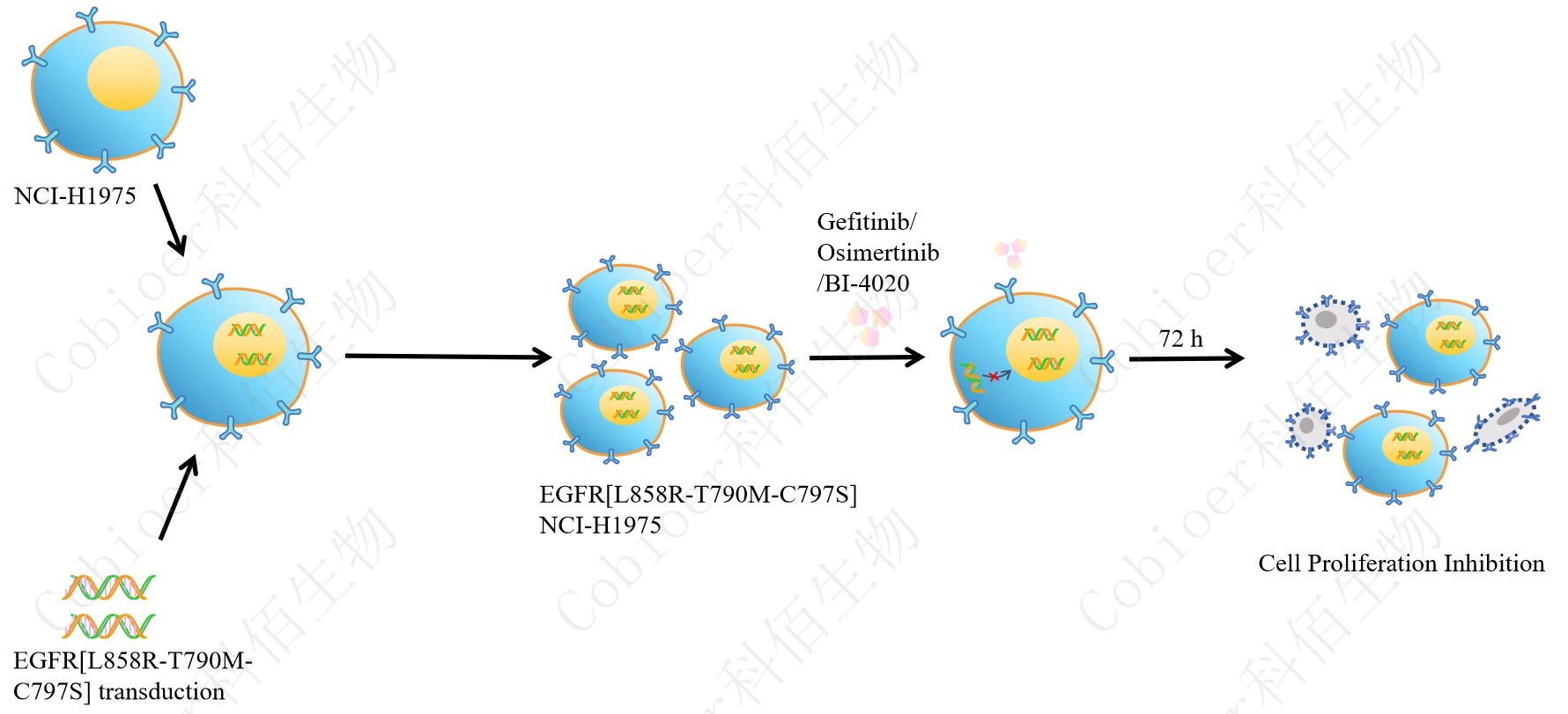 EGFR[L858R-T790M-C797S] NCI-H1975 藥靶細胞,通過轉(zhuǎn)導突變狀態(tài) 的 EGFR[L858R-T790M-C797S]基因到 NCI-H1975 細胞系中,穩(wěn)定表達人突變形態(tài)下的 EGFR[L858R-T790M-C797S]基因,原理及流程見下圖所示。![]() Figure 1. EGFR[L858R-T790M-C797S] NCI-H1975 細胞的構(gòu)建原理圖 |