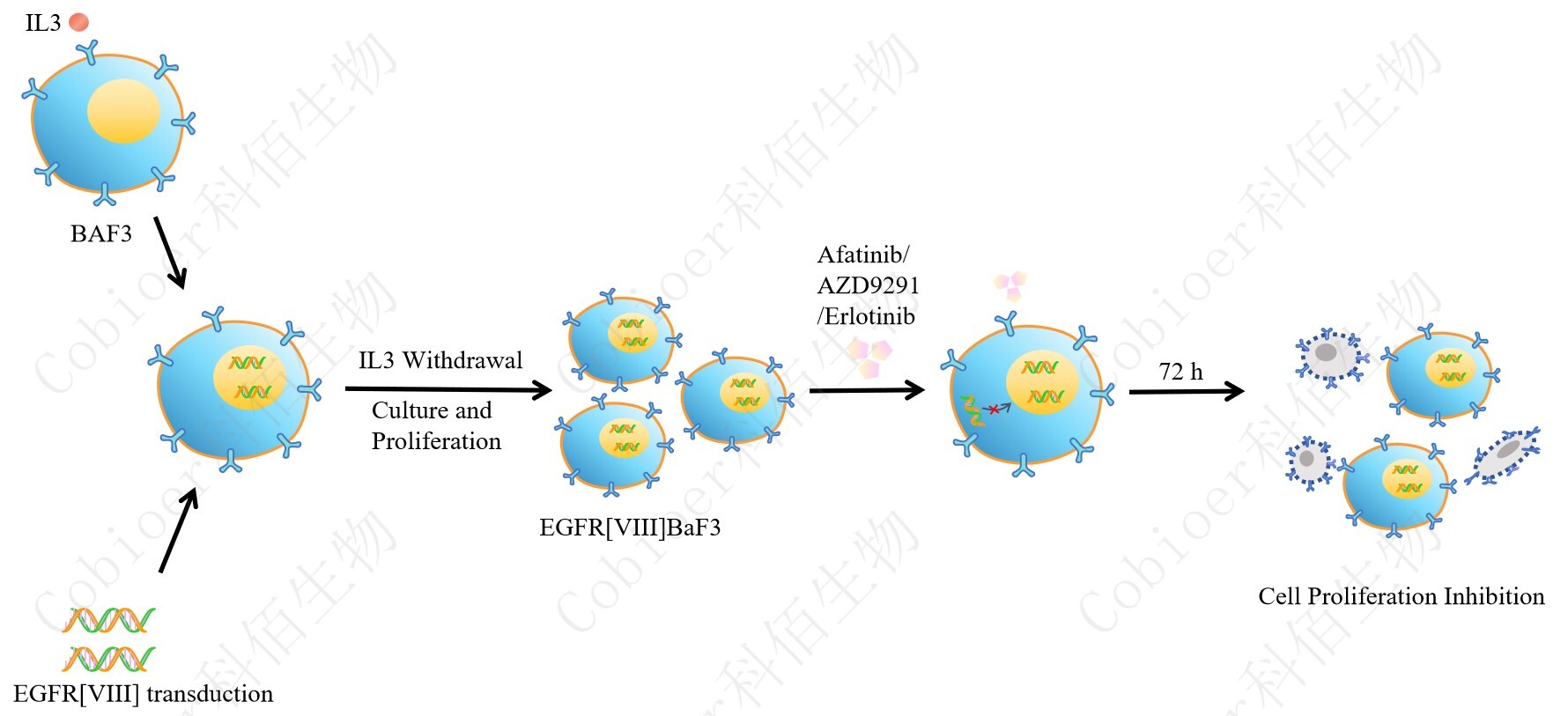 BaF3(小鼠原 B 細胞)的生長和增殖需要 IL-3 的維持。通過引入各種表達激酶的基因, 能作為 BaF3 的驅動基因,讓 BaF3 不再依賴 IL-3 而增殖,進而激酶基因成為 BaF3 增殖依 賴的驅動基因,用于評估小分子藥物對激酶的靶向抑制作用,原理及流程見下圖所示。