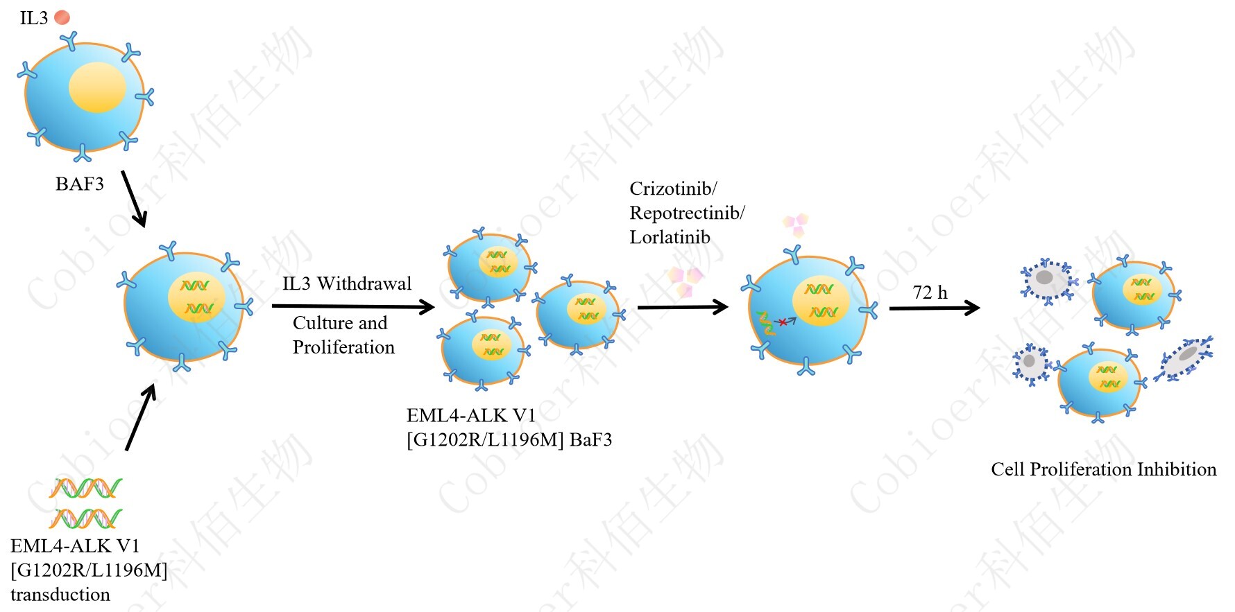 BaF3(小鼠原 B 細胞)的生長和增殖需要 IL-3 的維持。通過引入各種表達激酶的基因, 能作為 BaF3 的驅(qū)動基因,讓 BaF3 不再依賴 IL-3 而增殖,進而激酶基因成為 BaF3 增殖依 賴的驅(qū)動基因,用于評估小分子藥物對激酶的靶向抑制作用,原理及流程見下圖所示。