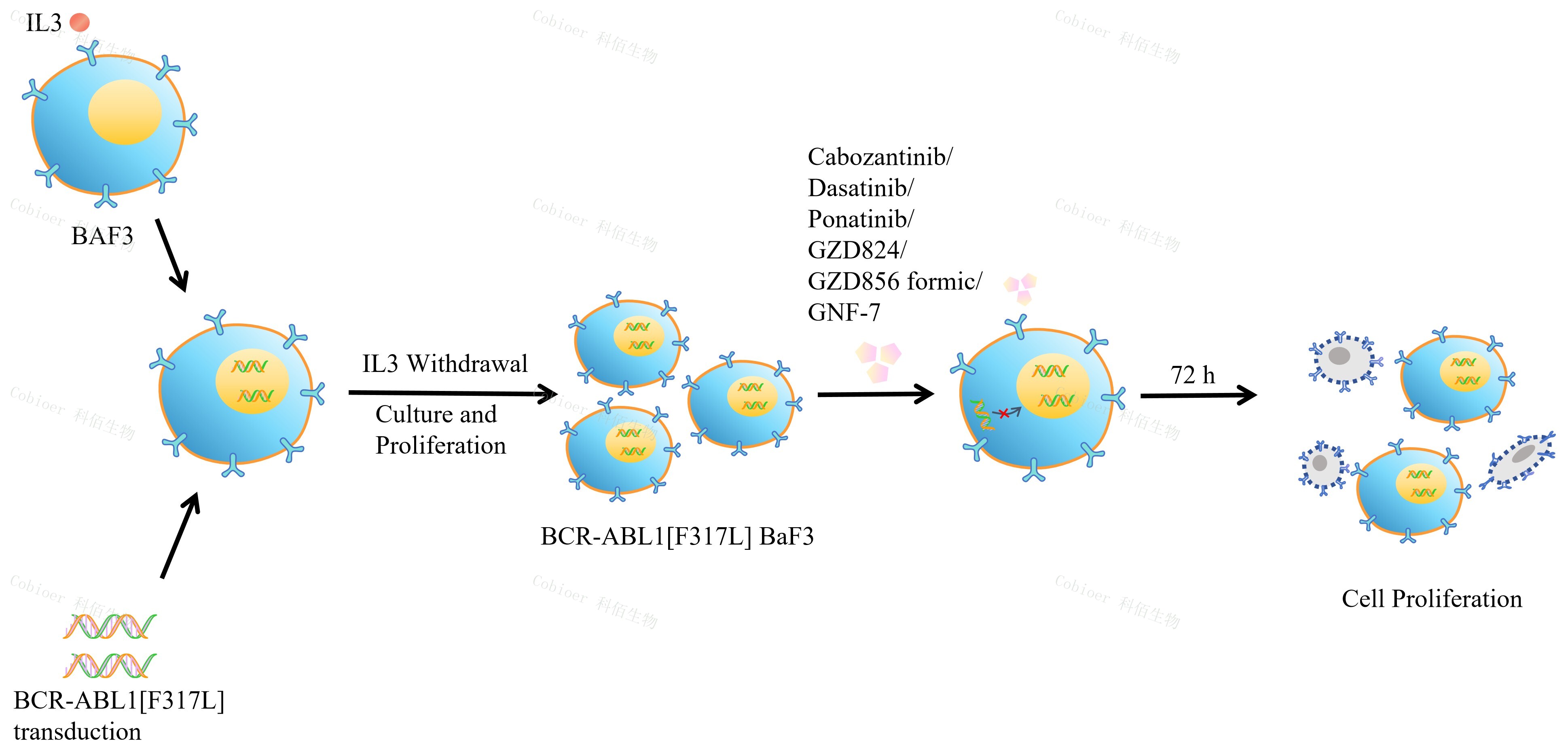 | BCR-ABL1[F317L] BaF3 藥靶細(xì)胞 , 通過轉(zhuǎn)導(dǎo)突變狀態(tài)的 BCR- ABL1[F317L]基因到 BaF3 細(xì)胞系中,穩(wěn)定表達(dá)人突變形態(tài)下的 BCR-ABL1[F317L]基因。 BaF3(小鼠原 B 細(xì)胞)的生長和增殖需要 IL-3 的維持。通過引入各種表達(dá)激酶的基因, 能作為 BaF3 的驅(qū)動基因,讓 BaF3 不再依賴 IL-3 而增殖,進(jìn)而激酶基因成為 BaF3 增殖依賴的驅(qū)動基因,用于評估小分子藥物對激酶的靶向抑制作用,原理及流程見下圖所示。 ![]() Figure 1. BCR-ABL1[F317L] BaF3 細(xì)胞的構(gòu)建原理圖 |