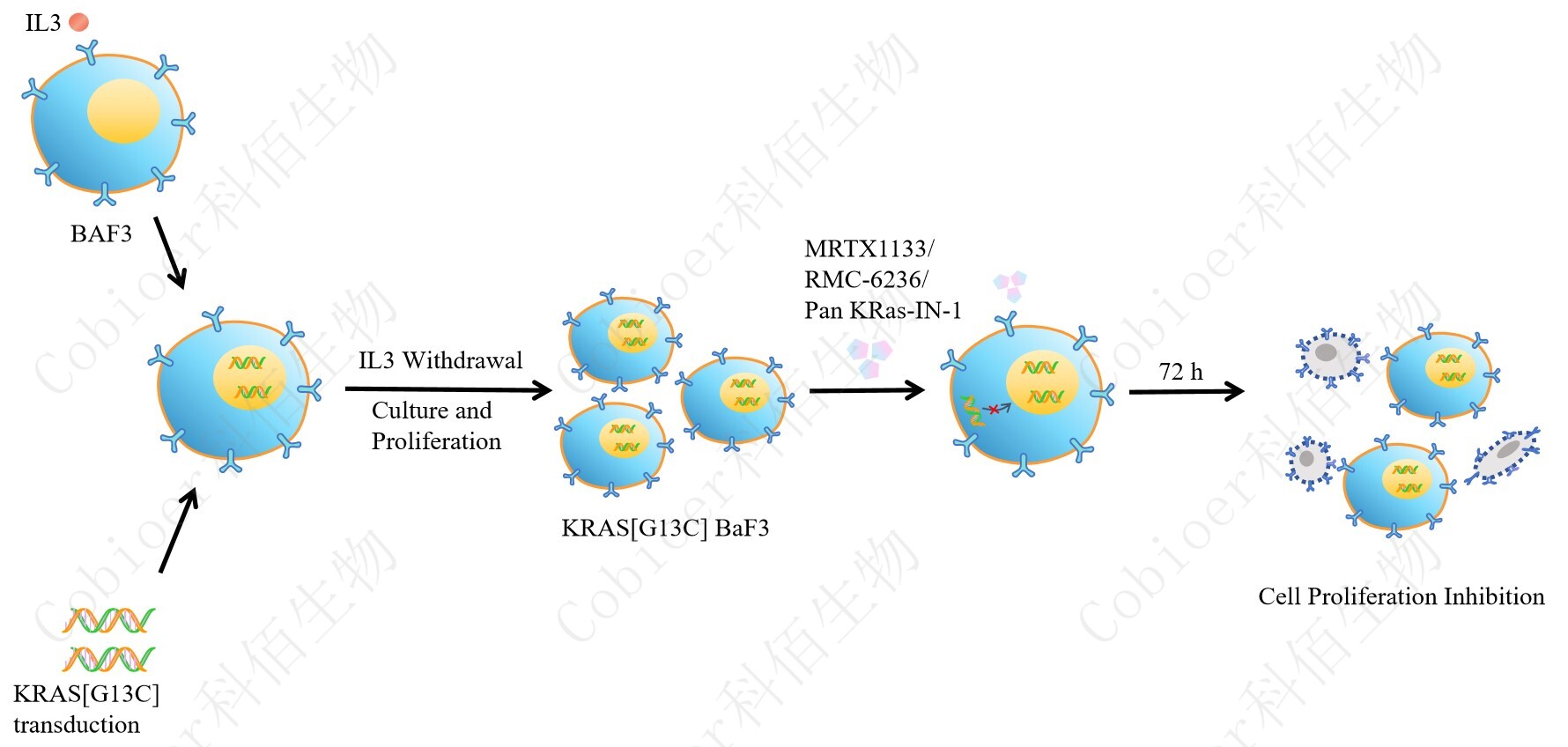 BaF3(小鼠原 B 細胞)的生長和增殖需要 IL-3 的維持。通過引入各種表達激酶的基因, 能作為 BaF3 的驅(qū)動基因,讓 BaF3 不再依賴 IL-3 而增殖,進而激酶基因成為 BaF3 增殖依賴的驅(qū)動基因,用于評估小分子藥物對激酶的靶向抑制作用,原理及流程見下圖所示。