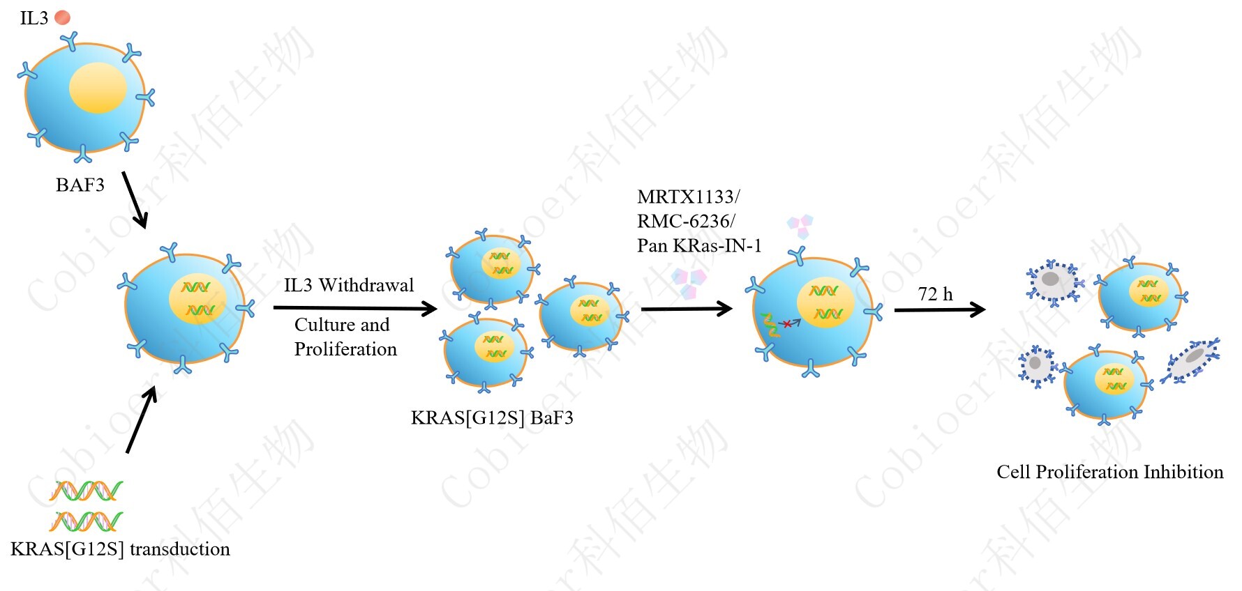 BaF3(小鼠原 B 細(xì)胞)的生長和增殖需要 IL-3 的維持。通過引入各種表達(dá)激酶的基因, 能作為 BaF3 的驅(qū)動基因,讓 BaF3 不再依賴 IL-3 而增殖,進(jìn)而激酶基因成為 BaF3 增殖依 賴的驅(qū)動基因,用于評估小分子藥物對激酶的靶向抑制作用,原理及流程見下圖所示。