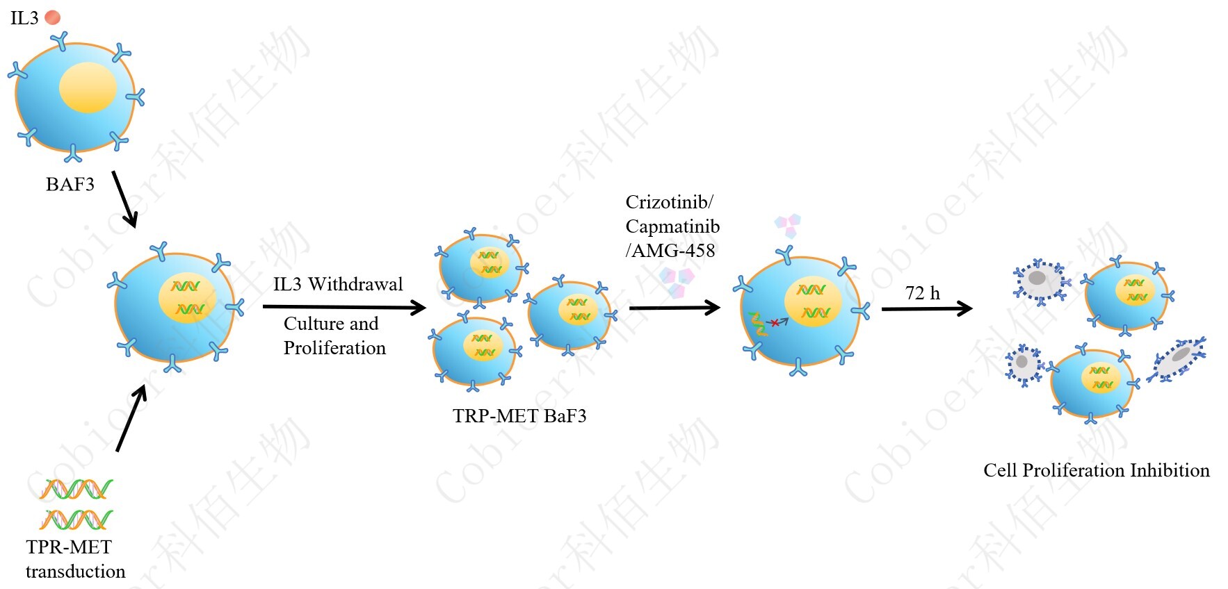 BaF3(小鼠原 B 細(xì)胞)的生長和增殖需要 IL-3 的維持。通過引入各種表達(dá)激酶的基因, 能作為 BaF3 的驅(qū)動基因,讓 BaF3 不再依賴 IL-3 而增殖,進(jìn)而激酶基因成為 BaF3 增殖依 賴的驅(qū)動基因,用于評估小分子藥物對激酶的靶向抑制作用,原理及流程見下圖所示。![]() Figure 1. TPR-MET BaF3 細(xì)胞的構(gòu)建原理圖 |