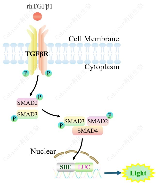 SBE-Luc HEK293 報(bào)告基因細(xì)胞,是由 SBE 調(diào)控并表達(dá) Luc 熒光素酶報(bào) 告基因的 HEK293 細(xì)胞。TGF-β與受體結(jié)合,激活 SBE 的原理見(jiàn)下圖所示。![]() Figure 1. SRE-Luc HEK293 細(xì)胞模型原理圖 |