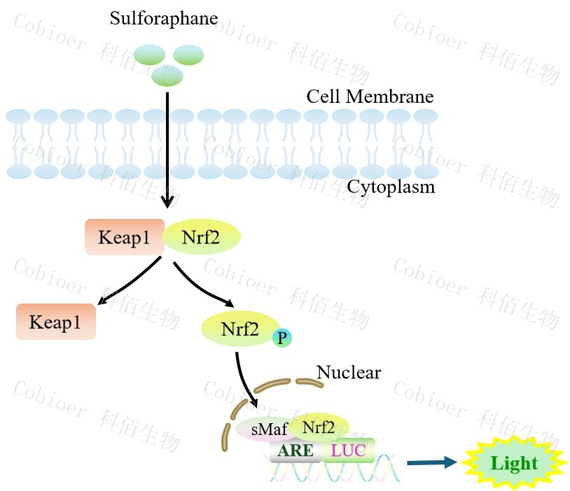 ARE-Luc(Nrf2 Antioxidant Pathway) HEK293 報(bào)告基因細(xì)胞,是由 ARE 調(diào)控并表達(dá) Luc 熒光素酶報(bào)告基因的 HEK293 細(xì)胞。Sulforaphane 是 Keap1/Nrf2/ARE 的誘 導(dǎo)劑,原理見(jiàn)下圖所示。![]() Figure 1. ARE-Luc(Nrf2 Antioxidant Pathway) HEK293 細(xì)胞模型原理圖