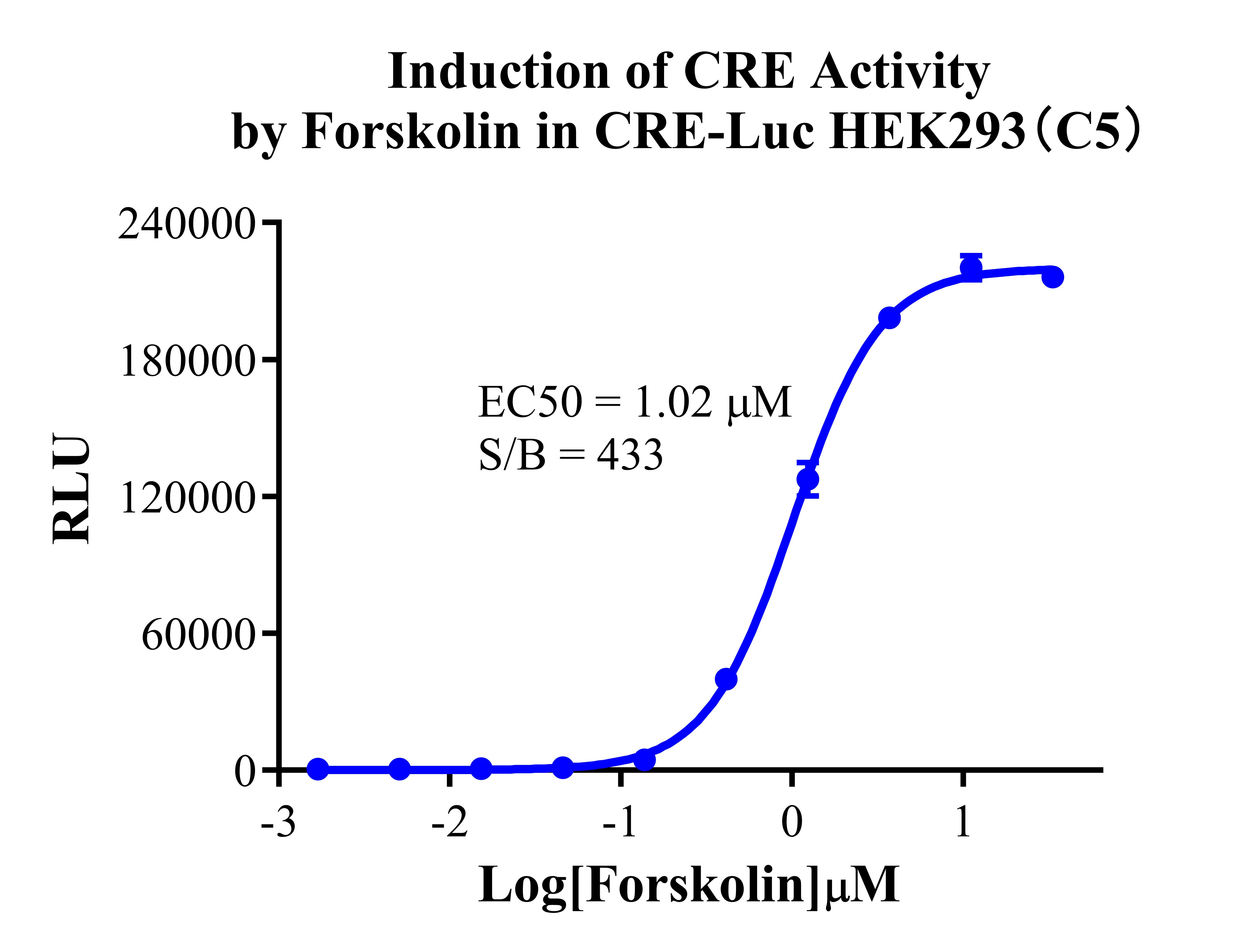 Figure 2. Detect Luciferase assay by Ultra Luciferase Detection Kit CBPH0001(we strongly suggest to purchase from Cobioer). Induction of CRE activity by Forskolin in CRE-Luc HEK293(C5). |