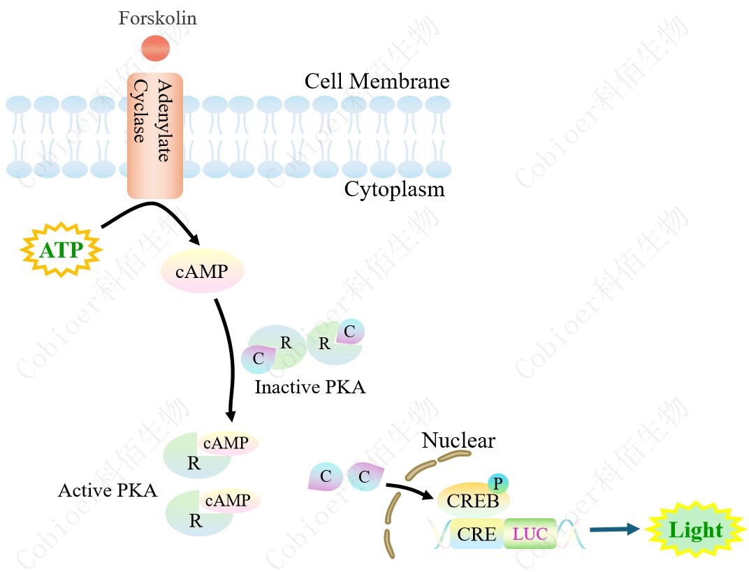 CRE-Luc HEK293 報告基因細胞是由 CRE 調(diào)控并表達 Luc 熒光素酶報告基因的 HEK293 細胞。Forskolin 是天然存在的直接腺苷酸環(huán)化酶(AC)/cAMP/CREB 的 激活劑,原理見下圖所示。![]() Figure 1:CRE-Luc HEK293 原理示意圖 |