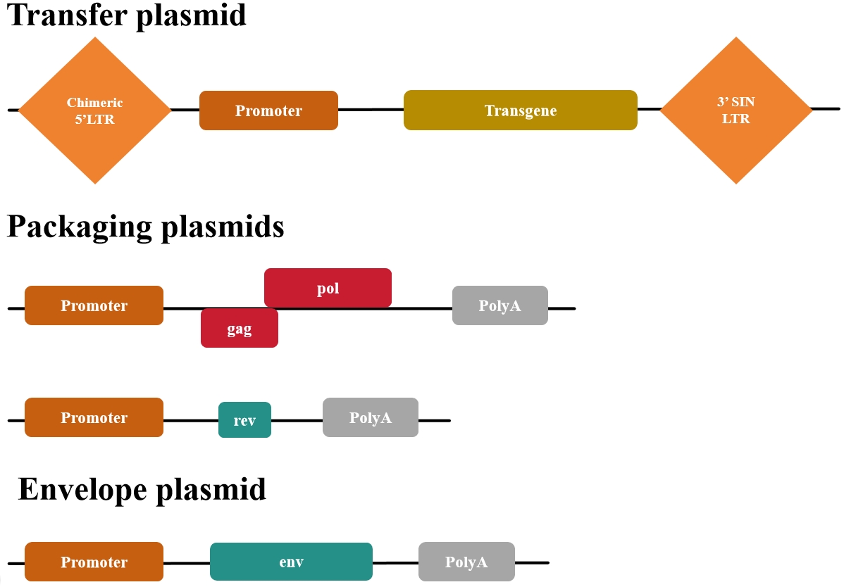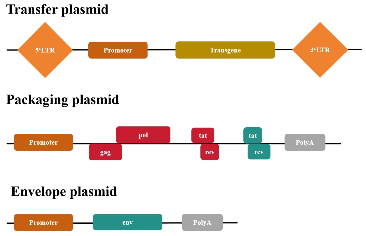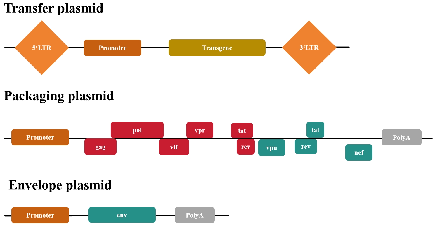 第一代慢病毒質(zhì)粒缺乏安全性改進以及無法生產(chǎn)具有復(fù)制能力的慢病毒(即產(chǎn)生能夠感染細胞并進一步自我復(fù)制的病毒顆粒),基本已經(jīng)廢棄使用了。