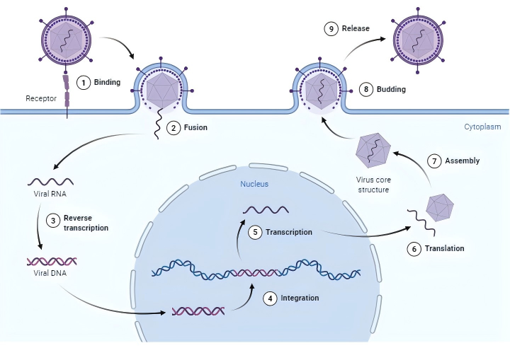 慢病毒(LV)是一種有包膜的病毒,最常見的是VSV-G,它通過與特定的細胞表面蛋白(比如LDLR)結(jié)合,隨后進行膜融合進入細胞,將含有其遺傳信息的病毒RNA注入細胞質(zhì)。這種單鏈病毒RNA通過逆轉(zhuǎn)錄轉(zhuǎn)化為DNA。病毒DNA進入細胞核,并通過病毒整合酶整合到宿主細胞基因組中。