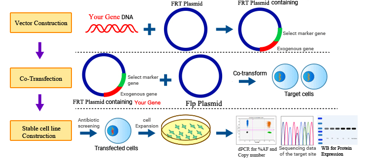 Flp-FRT整合系統(tǒng)是一種用于構(gòu)建穩(wěn)定細(xì)胞系的方法,該細(xì)胞系可在宿主細(xì)胞基因組的特定位置表達(dá)目的基因。該系統(tǒng)利用 Flp 重組酶和 FRT(Flp 重組靶位)位點實現(xiàn)位點特異性重組和整合。該系統(tǒng)可實現(xiàn)目的基因的穩(wěn)定表達(dá),確保細(xì)胞中蛋白質(zhì)的持續(xù)生產(chǎn)。