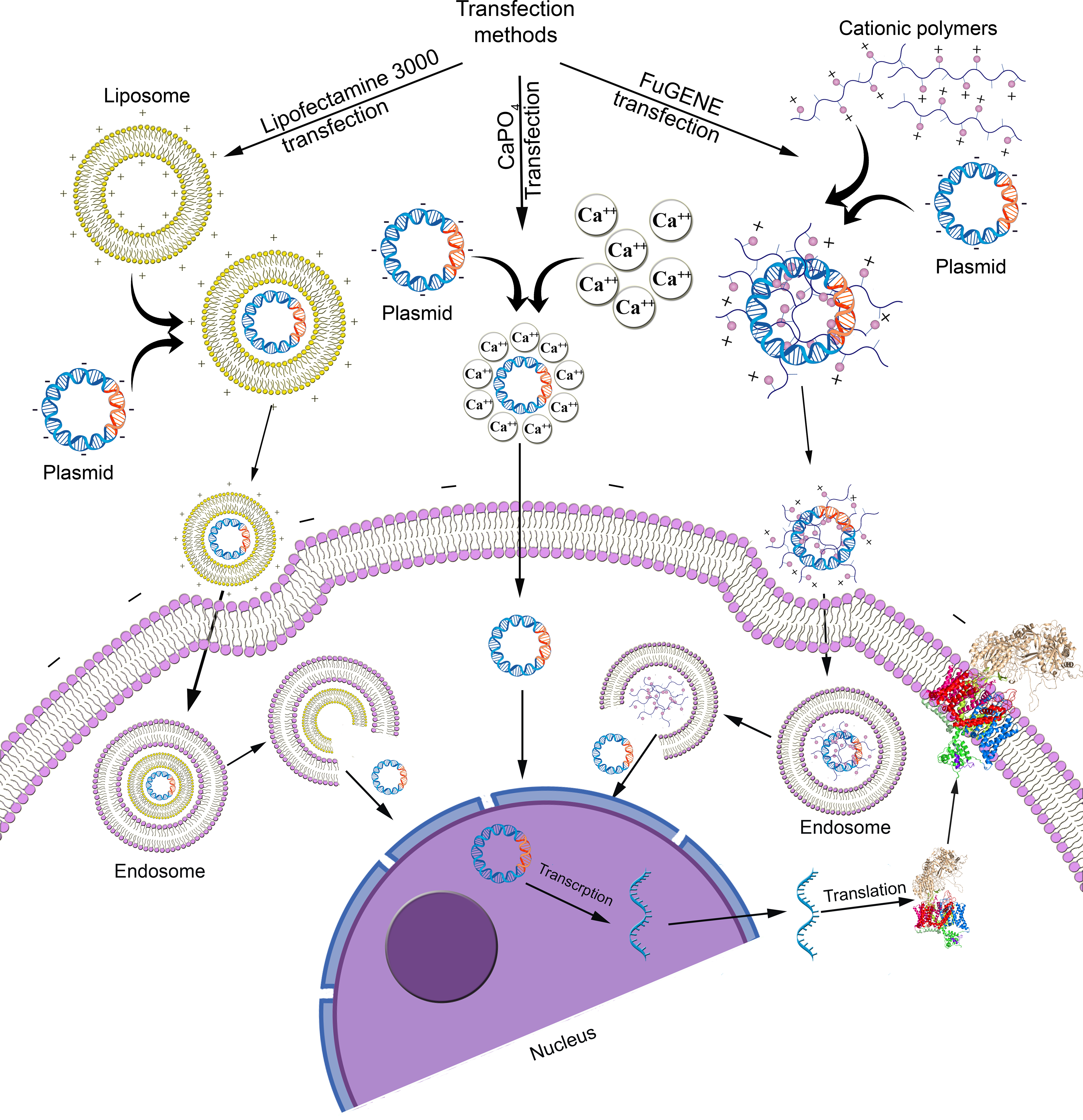 我們經(jīng)常使用的轉(zhuǎn)染化學(xué)試劑有Lipofectamine/CaPO4/FuGene/PEI等,原理基本是相同的: 1. 在體外混合質(zhì)粒和轉(zhuǎn)染試劑,質(zhì)粒DNA帶負(fù)電荷,轉(zhuǎn)染試劑帶正電荷,由轉(zhuǎn)染試劑包裹質(zhì)粒DNA在體外形成穩(wěn)定的復(fù)合物; 2. 外圍帶正電荷的復(fù)合物,接觸到帶負(fù)電荷的細(xì)胞膜,穿透細(xì)胞膜,形成Endosome(一種真核細(xì)胞內(nèi)的膜結(jié)合細(xì)胞器,屬于囊泡結(jié)構(gòu),是細(xì)胞內(nèi)吞作用中物質(zhì)運(yùn)輸?shù)年P(guān)鍵環(huán)節(jié)); 3. 在細(xì)胞質(zhì)內(nèi)釋放外源的質(zhì)粒DNA,DNA通過核孔進(jìn)入細(xì)胞核,參與外源基因的表達(dá)。