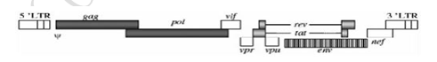 HIV-1為雙鏈RNA病毒,共有9個基因,如圖1所示。gag、pol、env3個基因編碼病毒的基本結(jié)構(gòu),tat、rev為調(diào)節(jié)基因,vif、vpr、vpu、nef 4個為輔助基因。其中,gag基因編碼病毒的核心蛋白,包括基質(zhì)蛋白、衣殼蛋白、核衣殼蛋白;pol基因編碼病毒復(fù)制所需的酶,如反轉(zhuǎn)錄酶、整合酶、蛋白酶,env基因編碼病毒的包膜糖蛋白,決定病毒感染宿主的靶向性。rev編碼的蛋白調(diào)節(jié)gag、pol、env的表達水平,tat編碼的蛋白參與RNA轉(zhuǎn)錄的控制。4個輔助基因編碼的蛋白則作為毒力因子參與宿主細胞的識別和感染。兩端為長末端重復(fù)序列(LTR),內(nèi)含復(fù)制所需的順式作用元件,如包裝信號元件Ψ。