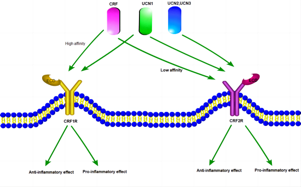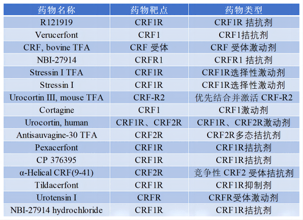 CRF1R和CRF2R主要是通過偶聯(lián)下游Gs蛋白參與體內(nèi)內(nèi)分泌系統(tǒng)、行為系統(tǒng)和免疫系統(tǒng)的壓力應答。CRF1R和CRF2R在體內(nèi)被內(nèi)源性配體CRF和UCN1-3 激活。與UCN1對CRF1R和CRF2R都有高親和力不同,CRF對CRF1R的親和力明顯高于CRF2R,而UCN2和UCN3則表現(xiàn)出了對CRF2R選擇性激動劑的活性。