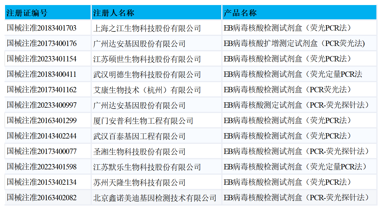 截至目前,已有12款EB病毒核酸檢測相關試劑盒獲批,具體如下:
