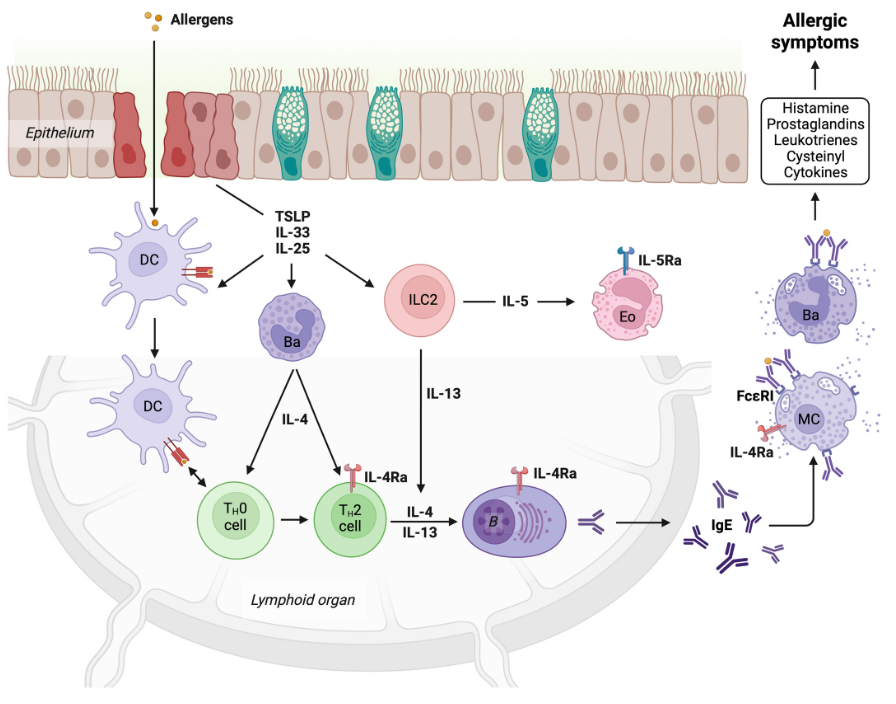 過敏的病因與Ⅱ型炎癥反應密切相關,會導致過敏原特異性免疫球蛋白E(IgE)的產生,這是許多過敏性疾病的關鍵驅動因素。在高水平上,初始的過敏原暴露會破壞上皮的完整性,通過包括IL-25、IL-33和TSLP在內的細胞因子觸發(fā)局部炎癥,這些炎癥激活Ⅱ型先天淋巴樣細胞以及其他免疫細胞來分泌Ⅱ型細胞因子IL-4、IL-5和IL-13,促進Th2細胞的發(fā)育和嗜酸性粒細胞的招募。Th2細胞依賴的B細胞激活促進了過敏原特異性IgE的產生,IgE穩(wěn)定地與嗜堿性細胞和肥大細胞表面的Fc段含高親和力受體(FcεRI)結合。在過敏原再次暴露后,這些細胞迅速脫粒導致過敏癥狀。