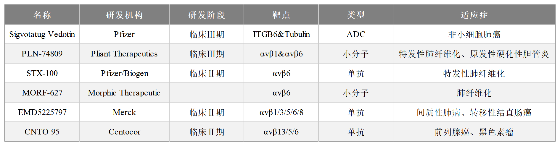 2025年JPM大會上,Pfizer 公布其Sigvotatug Vedotin(SGN-B6A)在非小細胞肺癌患者中良好的抗腫瘤活性和初步的療效,特別是在未接受過紫杉烷治療的非鱗狀NSCLC患者中,其療效更為顯著。整合素αvβ6作為纖維化和腫瘤治療的潛力靶點,近年來藥物研發(fā)進展迅速,涵蓋單抗、小分子、ADC及基因療法等領域。