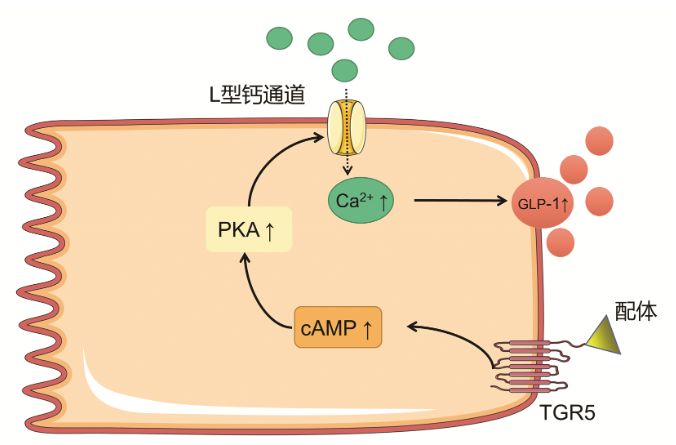 TGR5在維持葡萄糖穩(wěn)態(tài)和胰島素敏感性方面上的效果已得到廣泛證明。例如,使用TGR5激動劑6α-乙基-23(S)-甲基-膽酸(6α-ethyl-23(S)-methyl-cholic acid,INT-777)可以提高肥胖小鼠的胰島素敏感性,7-硫酸膽酸以TGR5依賴性方式增加胰島素抵抗小鼠的葡萄糖耐量等。機體各組織的TGR5可通過不同的分子機制參與血糖代謝的調(diào)節(jié)。TGR5對于血糖代謝的作用,主要與腸促胰島素釋放相關(guān),通過刺激腸內(nèi)分泌L細胞分泌GLP-1來實現(xiàn)。既往研究發(fā)現(xiàn),GLP-1可促進胰島素分泌,促進胰島β細胞存活和增殖,抑制細胞凋亡,并且可有效刺激2型糖尿病患者的胰島素分泌并降低血糖。早期觀點認(rèn)為TGR5被激活后刺激腸內(nèi)分泌L細胞內(nèi)cAMP水平增加,線粒體氧化磷酸化增加,ATP/ADP比例增加,導(dǎo)致ATP依賴性鉀離子通道(KATP)關(guān)閉,開放鈣離子通道,促進鈣離子內(nèi)流,釋放GLP-1。但后續(xù)大量研究驗證了GLP-1的分泌確實與cAMP升高,胞內(nèi)鈣離子升高有關(guān),但與ATP依賴性鉀離子通道無關(guān)。Brighton等的實驗進一步驗證了GLP-1分泌與L細胞內(nèi)的cAMP和Ca2+濃度變化有關(guān),并且說明了該作用主要由位于基底外側(cè)L細胞膜上的TGR5介導(dǎo)。近年來,Goldspink等發(fā)現(xiàn)腸L細胞上的TGR5被激活后,通過cAMP/PKA途徑,開放了L型Ca2+通道,促進Ca2+內(nèi)流,引發(fā)GLP-1分泌。