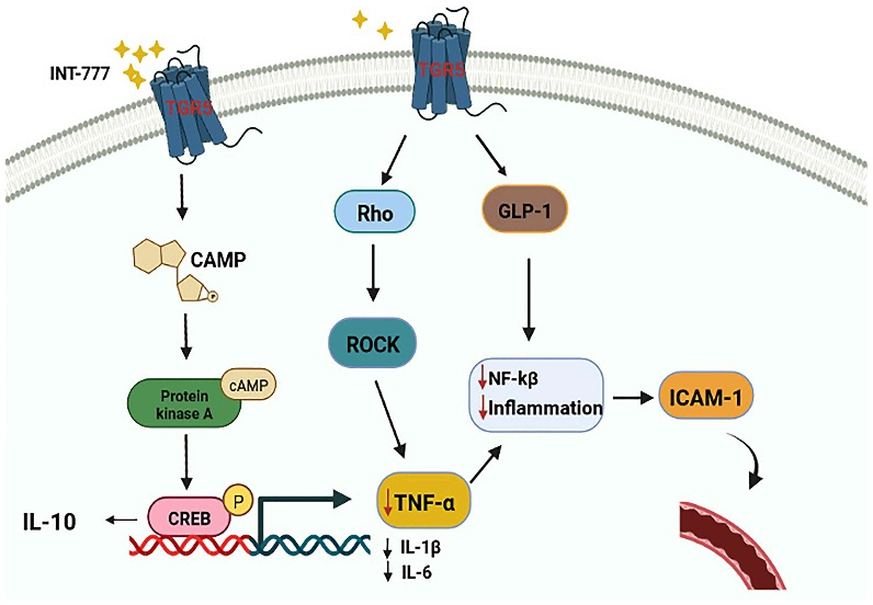 有報道稱,在慢性炎癥反應(yīng)中,TNF-α可激活多種半胱天冬酶,導(dǎo)致炎癥細胞凋亡。TGR5已被發(fā)現(xiàn)通過調(diào)節(jié)Rho/Rho相關(guān)蛋白激酶(ROCK)信號通路來調(diào)節(jié)TNF-α。作為TGR5的激動劑,INT-777可以阻斷TNF-α誘導(dǎo)的RMEC增殖和遷移,抑制TNF-α促進血管通透性的作用。此外,已有證據(jù)表明,TGR5激動劑可以通過激活TGR5- camp蛋白激酶A (PKA)信號通路,上調(diào)IL-10的表達,發(fā)揮抗炎和免疫抑制作用,降低促炎細胞因子IL-1β、IL-6和TNF-α的表達。有研究表明,GLP-1可通過抑制NF-κB延緩ECs的損傷,進而抑制IL-1β、IL-6、TNF-α等炎癥因子的分泌。而各種研究證實GLP-1是TGR5的靶點之一;其分泌依賴于TGR5。因此,推測激活TGR5可能是刺激GLP-1分泌、延緩RMEC損傷的有效途徑。