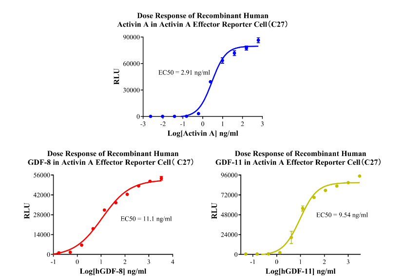 Figure 3.Dose Response of Recombinant Human Activin A in Activin A Effector Reporter Cell( C27).Dose Response of Recombinant Human GDF-8 in Activin A Effector Reporter Cell( C27).Dose Response of Recombinant Human GDF-11 in Activin A Effector Reporter Cell(C27).