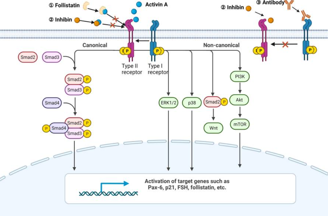 激活素A首先結(jié)合并促進ActRII的磷酸化,然后招募I型受體形成磷酸化多聚體。激活的受體復合物磷酸化SMAD2 和 SMAD3蛋白,磷酸化后的smad2/3與smad4蛋白結(jié)合成三聚體并易位到細胞核中調(diào)控相關基因的轉(zhuǎn)錄。