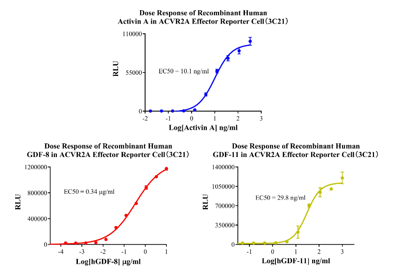 Figure 8. Dose Response of Recombinant Human Activin A in ACVR2A Effector Reporter Cell(3C21).Dose Response of Recombinant Human GDF-8 in ACVR2A Effector Reporter Cell (3C21). Dose Response of Recombinant Human GDF-11 in ACVR2A Effector Reporter Cell (3C21).