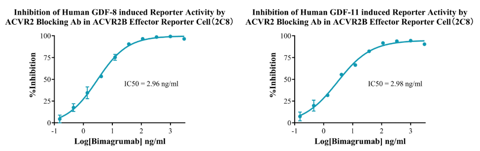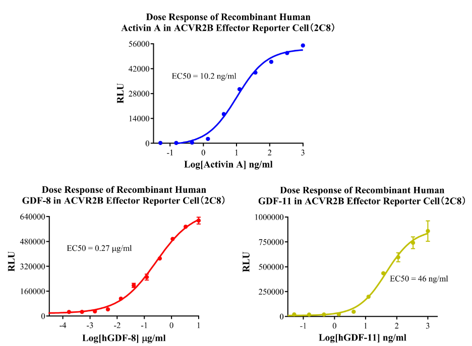 Figure 13.Dose Response of Recombinant Human Activin A in ACVR2B Effector Cell(2C8).Dose Response of Recombinant Human GDF-8 in ACVR2B Effector Reporter Cell(2C8).Dose Response of Recombinant Human GDF-11 in ACVR2B Effector Reporter Cell (2C8).