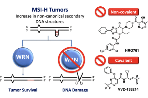 國際頂級期刊之一Nature于去年同一天上線了兩篇關(guān)于WRN(Werner綜合征RecQ解旋酶)抑制劑的文章,其中一篇是關(guān)于Novartis的HRO761的發(fā)現(xiàn)過程,另一篇介紹了拜耳(Bayer)旗下Vividion Therapeutics 公司的VVD-133214 (又叫RO7589831)的發(fā)現(xiàn)過程。這些文章重燃了醫(yī)藥行業(yè)對“WRN”這個合成致死靶點的關(guān)注。