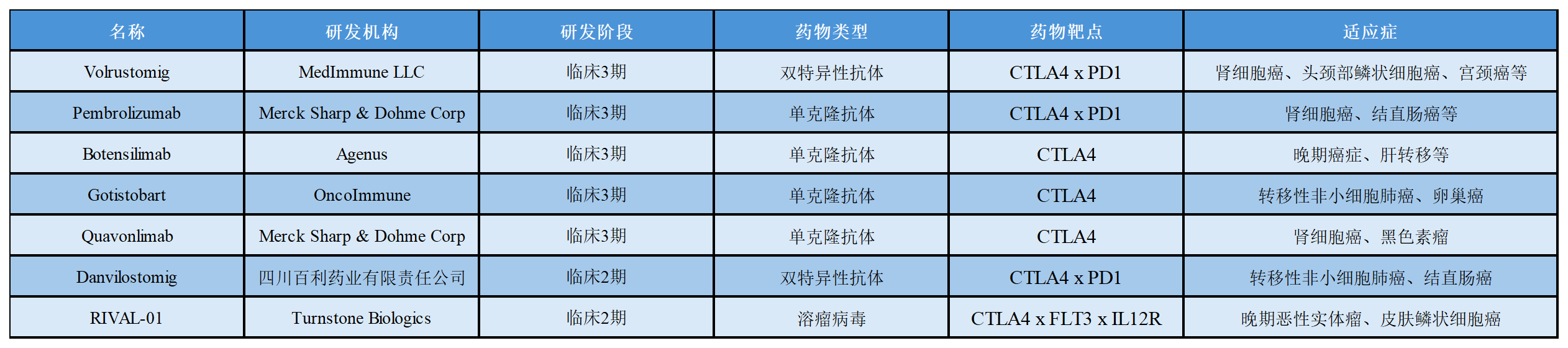 關于CTLA4在研的部分藥物進展如下表所示: