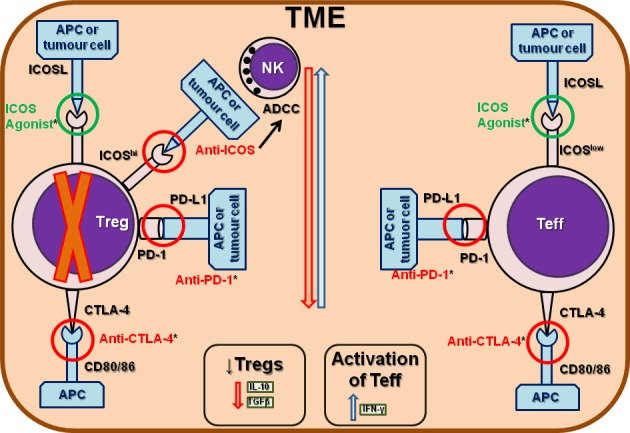 ICOS/ICOSL信號途徑已被證明可以促進(jìn)抗腫瘤T細(xì)胞反應(yīng)(當(dāng)在Th1和其他Teff中激活時(shí))或Tregs中觸發(fā)的前體反應(yīng)。因此,針對這一途徑的激動(dòng)性和拮抗性單克隆抗體正在被研究用于癌癥免疫療法。在臨床前研究中,ICOS激動(dòng)性單克隆抗體增強(qiáng)了抗CTLA-4的作用。有文獻(xiàn)表明ICOS敲除小鼠對抗CTLA-4反應(yīng)不佳,表明ICOS信號傳導(dǎo)是有效抗腫瘤反應(yīng)所必需的,可能由Teff介導(dǎo)。因此,與單獨(dú)使用抗-CTLA-4相比,同時(shí)使用CTLA-4和ICOS刺激具有更好的抗腫瘤效果。有趣的是,使用抗-CTL a-4或抗-PD-1治療的小鼠和患者擴(kuò)大了ICOShi(FoxP3-)CD4+和CD8+T細(xì)胞亞群,表明ICOShi T細(xì)胞可能是臨床反應(yīng)的重要生物標(biāo)志物,從而使治療受益。與癌癥免疫療法靶向的其他途徑相比,單獨(dú)使用ICOS似乎效果較差,主要是因?yàn)镃D4+Tregs占主導(dǎo)地位。使用ICOS激動(dòng)劑或拮抗劑Abs與CTLA-4或PD-1/PD-L1聯(lián)合使用有可能產(chǎn)生強(qiáng)效的協(xié)同作用。
