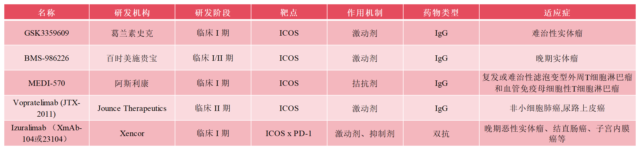 ICOS/ICOS-L信號通路在腫瘤領(lǐng)域具有雙重作用。一方面,ICOS/ICOS-L的共刺激信號可參與抗腫瘤T細(xì)胞反應(yīng)。另一方面,ICOS信號傳導(dǎo)也具有促腫瘤作用?,F(xiàn)階段正在研發(fā)的ICOS抗體主要包括激動(dòng)劑和拮抗劑兩種。激動(dòng)劑主要通過和ICOS結(jié)合增強(qiáng)免疫作用。拮抗劑主要是為了阻止調(diào)控ICOS陽性T細(xì)胞累積,抑制CD4+浸潤性T細(xì)胞分泌IL-10,以此消除Treg介導(dǎo)的免疫抑制,并可能增強(qiáng)針對腫瘤細(xì)胞的細(xì)胞毒性T淋巴細(xì)胞(CTL)介導(dǎo)的免疫應(yīng)答,主要用于血液癌癥。目前在全球范圍內(nèi)尚無針對ICOS靶點(diǎn)的藥物獲批上市。目前部分藥企研發(fā)進(jìn)展如下: