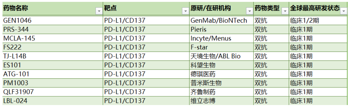 由于4-1BB在高度耗竭的PD-1高表達CD8+TIL上顯著表達,并且在PD-1阻斷后進一步上調(diào),而4-1BB信號傳導(dǎo)則會誘導(dǎo)CD8+TIL的克隆擴增,CD8+TIL表現(xiàn)出腫瘤反應(yīng)性而無終末分化,因此4-1BB和PD-L1可能是誘導(dǎo)T細胞抗腫瘤反應(yīng)機制上的一對好搭檔。針對這兩者開發(fā)雙特異性抗體是一種極具前景的開發(fā)策略,引得國內(nèi)外玩家紛紛參與,目前已有十余款針對PD-L1/4-1BB的雙抗藥物處于不同的研發(fā)介段,下表列舉了部分已進入臨床的雙抗藥物: