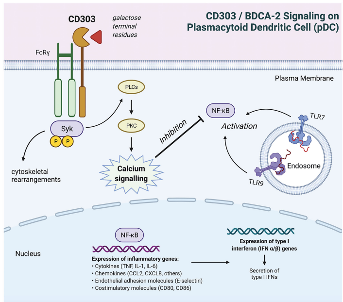 BDCA-2 (blood DC antigen 2血液樹突狀細胞抗原2)又叫CLEC4C或CD303,是人類pDCs特有的II型c型凝集素受體(CLR),與TLR-7/9協(xié)同識別微生物和協(xié)調(diào)炎癥免疫反應。BDCA-2是一種可溶性跨膜糖蛋白,由聚集在12號染色體上的c型凝集素編碼基因編碼,包括KLRG1和CLEC4A。與其他CLR類似,BDCA-2具有單個胞外碳水化合物識別結(jié)構域,并且在其短細胞質(zhì)尾部缺乏固有的信號基序。BDCA-2選擇性地與IgG分子上的半乳糖端聚糖結(jié)合,產(chǎn)生抗炎反應來抵抗因為通過抗原吸收、內(nèi)化、呈遞給T細胞以及信號通路如IFN-I,NF-kB等其他炎性體激活。BDCA-2與跨膜區(qū)的FcRγ鏈形成adaptor,允許酪氨酸激酶募集磷酸化以及鈣動員,類似于b細胞受體(BCR)信號體,BDCA-2信號通過免疫受體酪氨酸激活發(fā)生基序(ITAM)介導的酪氨酸(Syk)磷酸化,磷脂酰肌醇特異性磷酯酶(PLCγ2),PKC的激活等誘導鈣流入并在pDC中充當負調(diào)節(jié)劑,介導IFN-Ⅰ抑制并通過BDCA2觸發(fā)減少NFKB的激活。