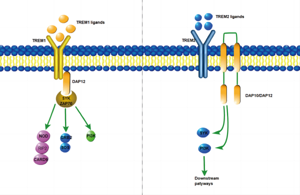TREM(Triggering receptor expressed on myeloid cells)家族屬于細(xì)胞表面受體,介導(dǎo)調(diào)控炎癥反應(yīng)。TREM1屬于髓系細(xì)胞表面受體,在多種腫瘤微環(huán)境中均表達(dá),協(xié)同經(jīng)典的模式識(shí)別受體(PRR),例如Toll-like受體(TLR)家族和Nod-like受體(NLR)家族,在宿主防御中放大由微生物成分介導(dǎo)的炎癥反應(yīng),具有抗腫瘤的作用。TREM2(Triggering receptor expressed on myeloid cells-2)是免疫球蛋白超家族的跨膜受體,僅在中樞神經(jīng)系統(tǒng)(CNS)的小膠質(zhì)細(xì)胞等骨髓細(xì)胞中表達(dá)。TREM2有多種配體,主要有APOE, HDL, LDL以及Aβ等。TREM2通過其與接頭蛋白DAP12和DAP10的關(guān)聯(lián)發(fā)出信號(hào)。DAP12是參與先天免疫應(yīng)答的細(xì)胞中表達(dá)的信號(hào)傳導(dǎo)銜接蛋白,介導(dǎo)脾酪氨酸激酶SYK的激活,DAP12促進(jìn)質(zhì)膜上TREM2的穩(wěn)定,可以調(diào)控細(xì)胞的增殖,生存以及炎癥等信號(hào)通路。TREM2還可以結(jié)合DAP10,而DAP10通過招募磷脂酰肌醇3-激酶(PI3K)促進(jìn)信號(hào)傳導(dǎo)。