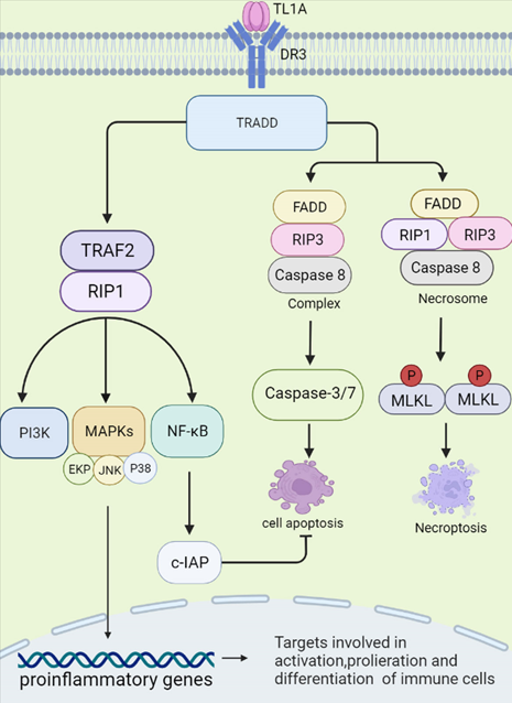 在靜息的T細胞中,DR3以可溶性形式表達,保護細胞免于凋亡?;罨腡細胞表達跨膜DR3。sTL1A結(jié)合DR3 (膜結(jié)合形式)激活下游信號級聯(lián),從而調(diào)節(jié)免疫反應和炎癥。sTL1A/DR3相互作用可觸發(fā)兩種不同的信號通路,分別引起炎癥和細胞凋亡。首先,DR3的死亡結(jié)構(gòu)域與細胞質(zhì)中的適配蛋白TNFR相關死亡結(jié)構(gòu)域蛋白(TRADD)結(jié)合,然后招募TNFR相關因子2 (TRAF2)和受體相互作用蛋白1 (RIP1)。這些復合物激活MAPKs (ERK、p38和JNK)、NF-κB和效應激酶PI3K信號傳導。最后,激活的信號傳導調(diào)節(jié)促炎基因的表達,參與免疫相關疾病的發(fā)生。TRADD結(jié)合FAS相關死亡結(jié)構(gòu)域(FADD)和RIP3,激活半胱氨酸天冬氨酸特異性蛋白酶-8 (caspase-8)形成復合物,進一步激活下游caspase通路(如caspase-3和-7),誘導凋亡細胞死亡。當caspase-8活性被阻斷時,F(xiàn)ADD、RIP3、RIP1與下游效應分子混合譜系激酶結(jié)構(gòu)域樣蛋白(mixed lineage kinase domain-like protein, MLKL)在磷酸化后形成胞質(zhì)“壞死體”復合體。然后,MLKL寡聚到細胞膜上,導致壞死性細胞死亡,這是一種伴有強烈炎癥的細胞死亡形式。在這個過程中,NF-κB被證明可以誘導細胞凋亡抑制蛋白(c-IAP)的激活,從而介導細胞凋亡的負反饋調(diào)節(jié)和抑制。事實上,更多的證據(jù)表明,sTL1A與DR3的連接優(yōu)先誘導淋巴細胞的促炎途徑而不是凋亡。