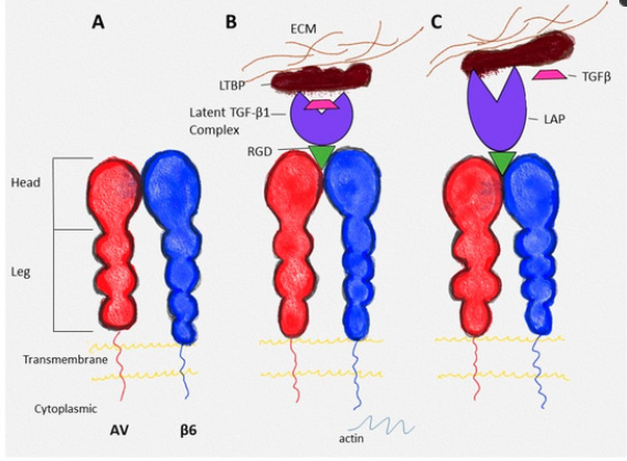 整合素αvβ6特異的配體主要配體包括細胞外基質蛋白如纖維連接蛋白(Fibronectin)、層粘連蛋白(Laminin)以及潛活形式的TGF-β。潛伏期相關肽(LAP)是轉化生長因子β(TGF-β)前體肽的氨基末端結構域,形成潛在的 TGF-β 復合物,并充當整合素 αvβ6 的配體。當整合素 αvβ6 通過LAP與細胞外位點的潛在TGF-β復合物結合時,同時與細胞內細胞骨架結合時,活性TGF-β從潛在復合物中釋放出來,驅動纖維化和免疫抑制微環(huán)境形成;此外,αvβ6還可作為口蹄疫病毒(FMDV)等病原體的入侵受體。