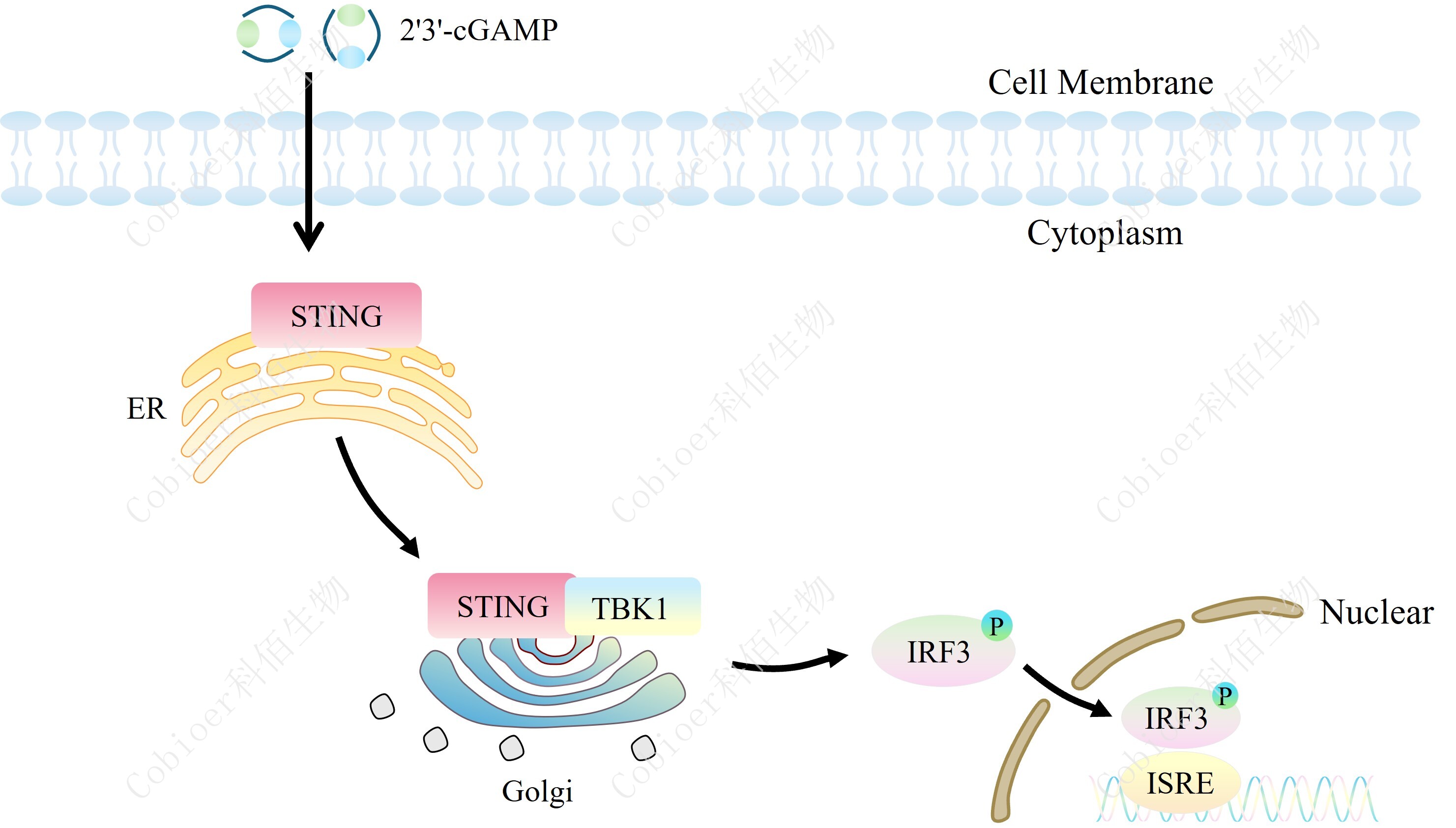 ISRE-Luc RAW264.7 報告基因細胞,是由 ISRE 調(diào)控并表達 Luc 熒光素 酶報告基因的 RAW264.7 細胞。RAW264.7 是小鼠巨噬細胞的常用模型,用于研究細胞對 微生物及其產(chǎn)物的反應(yīng)。RAW 264.7 衍生細胞內(nèi)源性表達許多 PRR,包括 toll 樣受體 (TLR)、NOD 樣受體 (NLR)、RIG-I 樣受體 (RLR) 和 C 型凝集素受體 (CLR)。 STING 激活的原理見下圖所示。