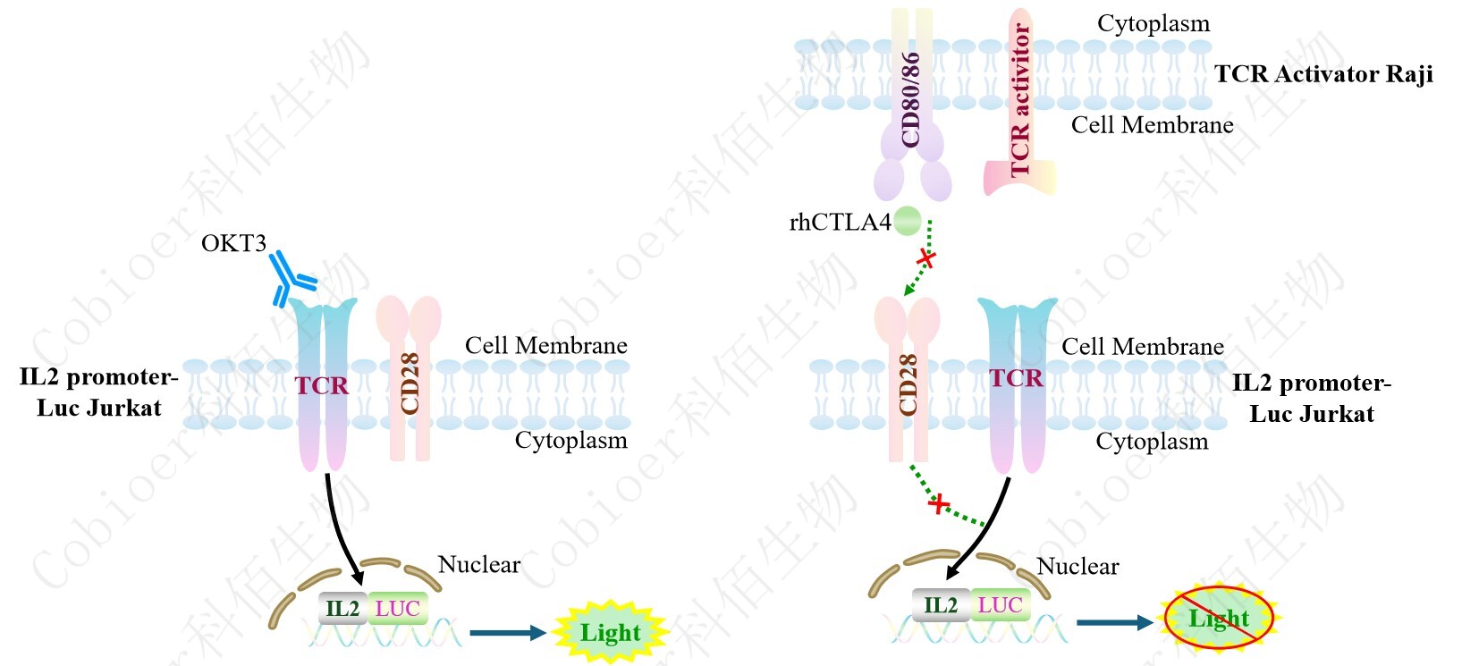 IL2 promoter-Luc Jurkat 報(bào)告基因藥靶模型很好的模擬了體內(nèi) IL2 的信號(hào)轉(zhuǎn)導(dǎo)過程,原 理見下圖所示。![]() |