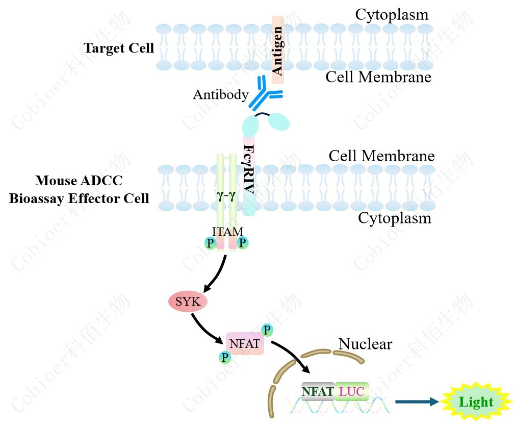 Mouse ADCC Bioassay Effector Cell 報告基因藥靶模型很好的模擬了體內(nèi) ADCC 的信號轉(zhuǎn)導過程,原理見下圖所示。