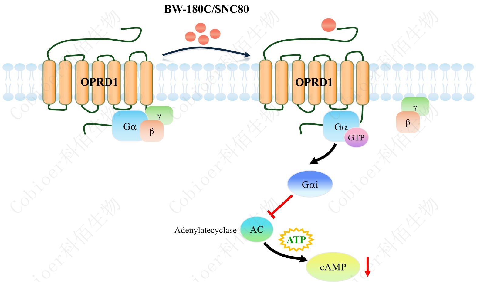 阿片受體家族包括κ-阿片受體(KOP)、 δ-阿片受體(DOP)、µ-阿片受體(MOP) 和痛覺肽阿片受體(NOP),均屬于 G 蛋白偶聯(lián)受體,主要通過偶聯(lián)下游 Gi 蛋白發(fā)揮功 能。OPRD1 是一種 G 蛋白偶聯(lián)受體,作為內(nèi)源性腦啡肽和其他阿片亞群的受體。配體結(jié)合 引起構(gòu)象改變,通過鳥嘌呤核苷酸結(jié)合蛋白(G 蛋白)觸發(fā)信號,并調(diào)節(jié)下游效應(yīng)物(如腺苷 酸環(huán)化酶)的活性。信號傳導(dǎo)導(dǎo)致腺苷酸環(huán)化酶活性的抑制。它通過減少鈣離子電流和增加 鉀離子電導(dǎo)來抑制神經(jīng)遞質(zhì)釋放。它在疼痛的感知和阿片介導(dǎo)的鎮(zhèn)痛中起作用。 |