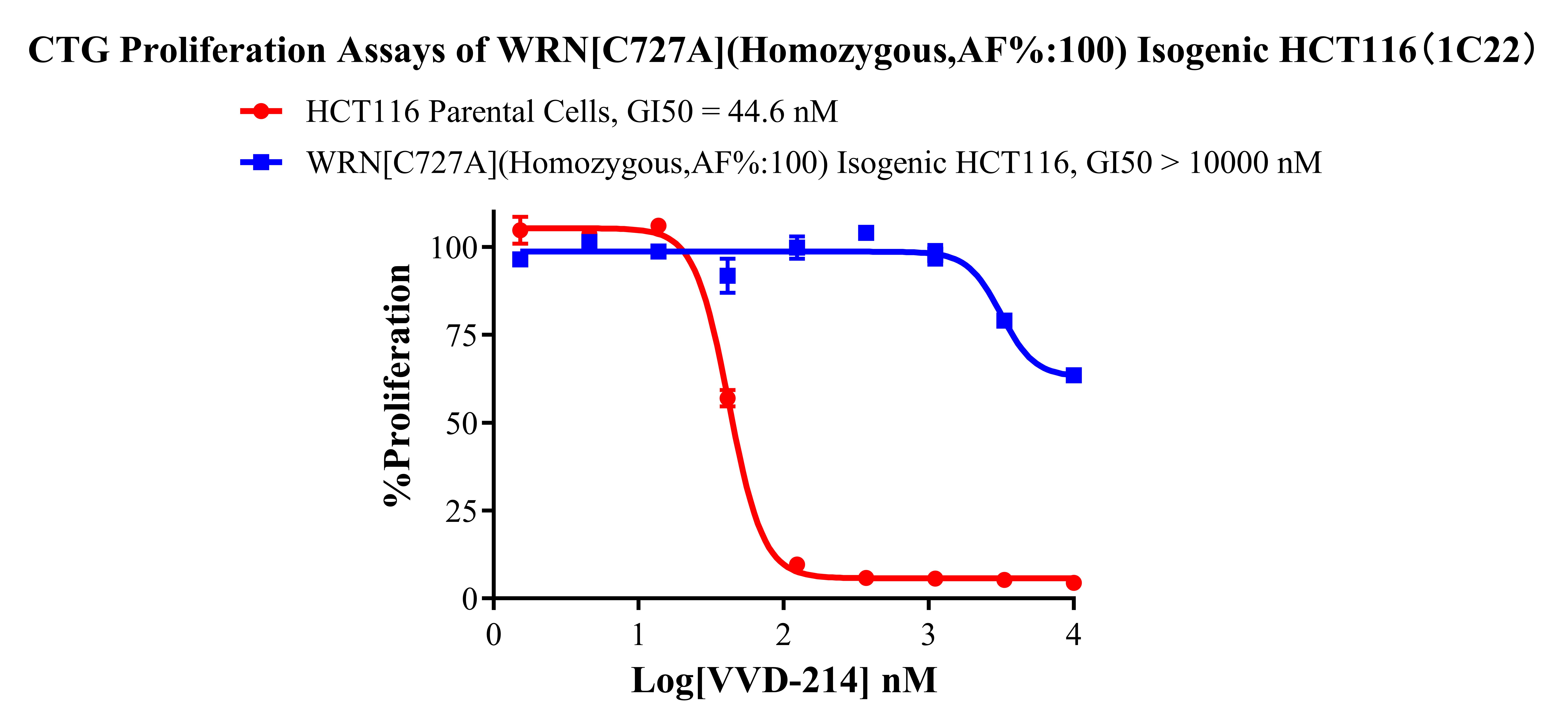 ![]() Figure 2. Sanger of WRN[C727A](Homozygous,AF%:100) Isogenic HCT116 ![]() Figure 3. A:HCT116 Parental Cell;B:WRN[C727A](Homozygous,AF%:100) Isogenic HCT116 通道2 藍(lán)色微滴代表WRN[C727A]突變陽(yáng)性,通道2 綠色微滴代表該位點(diǎn)為陰性野生型 ![]() Figure 4. CTG Proliferation Assays of WRN[C727A](Homozygous,AF%:100) Isogenic HCT116(1C22). ![]() Figure 5. CTG Proliferation Assays of WRN[C727A](Homozygous,AF%:100) Isogenic HCT116(1C22). |